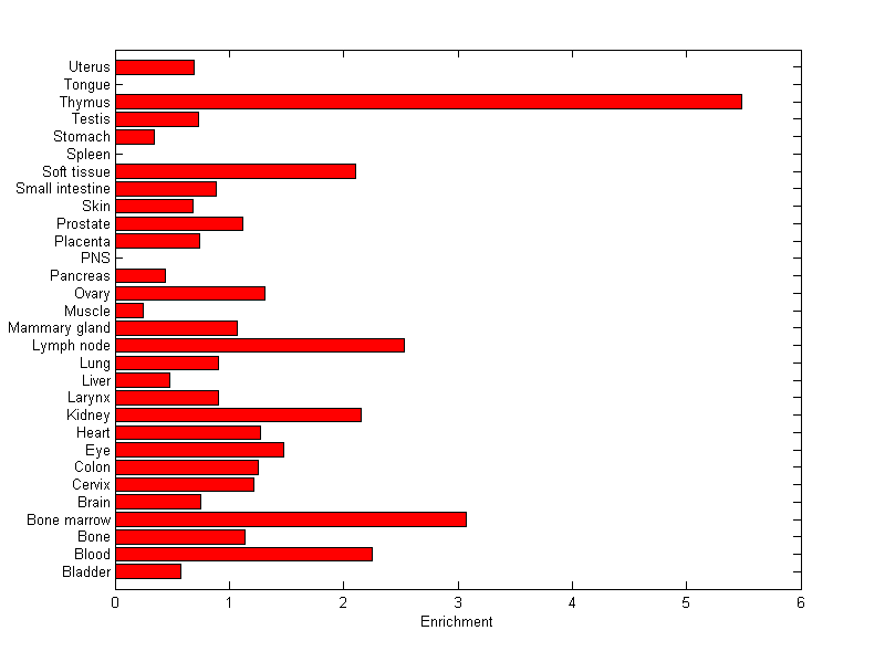 The expression level is normalized with tissue-library size. Each value for a gene in a tissue is a ratio of observed ESTs to the expected one in this tissue. The expected number of ESTs is the product of total ESTs of the gene and the fraction of total ESTs in the tissue among all ESTs in 30 tissues.