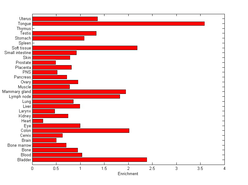 The expression level is normalized with tissue-library size. Each value for a gene in a tissue is a ratio of observed ESTs to the expected one in this tissue. The expected number of ESTs is the product of total ESTs of the gene and the fraction of total ESTs in the tissue among all ESTs in 30 tissues.