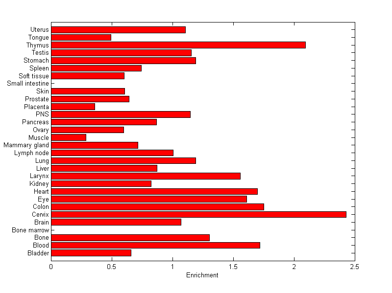 The expression level is normalized with tissue-library size. Each value for a gene in a tissue is a ratio of observed ESTs to the expected one in this tissue. The expected number of ESTs is the product of total ESTs of the gene and the fraction of total ESTs in the tissue among all ESTs in 30 tissues.