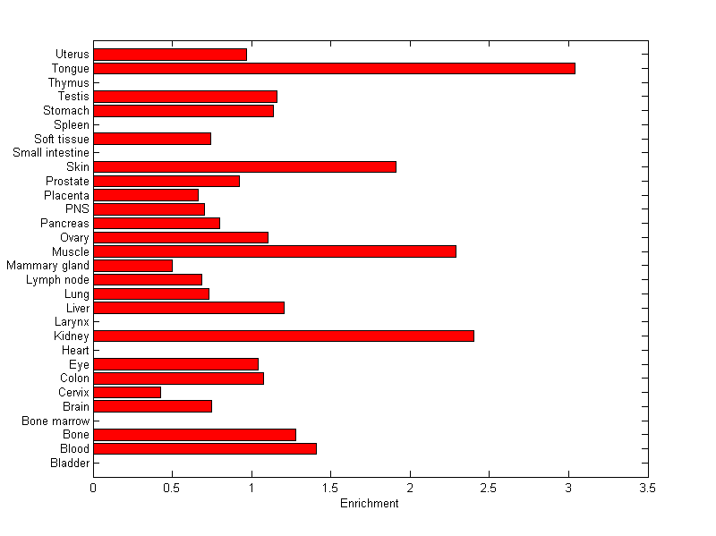 The expression level is normalized with tissue-library size. Each value for a gene in a tissue is a ratio of observed ESTs to the expected one in this tissue. The expected number of ESTs is the product of total ESTs of the gene and the fraction of total ESTs in the tissue among all ESTs in 30 tissues.