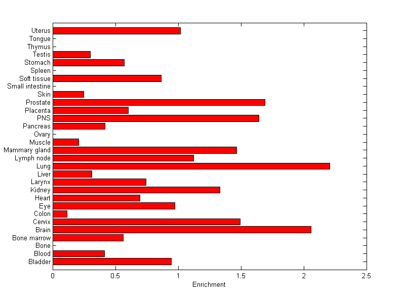 The expression level is normalized with tissue-library size. Each value for a gene in a tissue is a ratio of observed ESTs to the expected one in this tissue. The expected number of ESTs is the product of total ESTs of the gene and the fraction of total ESTs in the tissue among all ESTs in 30 tissues.