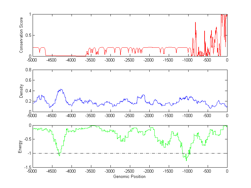 The energy profile (green curve) is about energy for module detection based on TF interaction. The positions with energy less than -1 indicate the existence of CRMs.