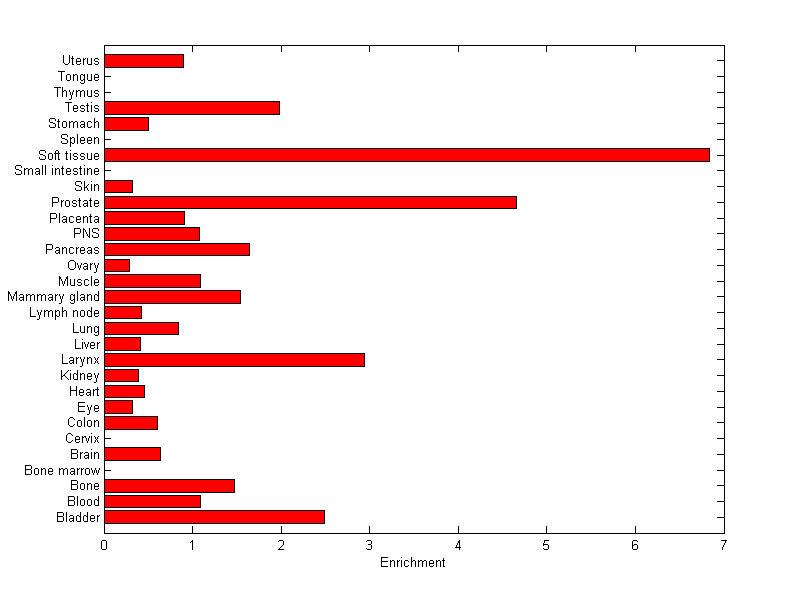 The expression level is normalized with tissue-library size. Each value for a gene in a tissue is a ratio of observed ESTs to the expected one in this tissue. The expected number of ESTs is the product of total ESTs of the gene and the fraction of total ESTs in the tissue among all ESTs in 30 tissues.