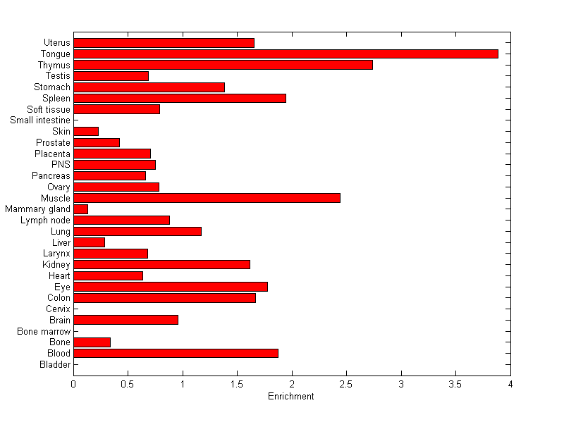 The expression level is normalized with tissue-library size. Each value for a gene in a tissue is a ratio of observed ESTs to the expected one in this tissue. The expected number of ESTs is the product of total ESTs of the gene and the fraction of total ESTs in the tissue among all ESTs in 30 tissues.