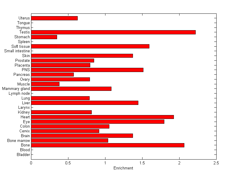 The expression level is normalized with tissue-library size. Each value for a gene in a tissue is a ratio of observed ESTs to the expected one in this tissue. The expected number of ESTs is the product of total ESTs of the gene and the fraction of total ESTs in the tissue among all ESTs in 30 tissues.