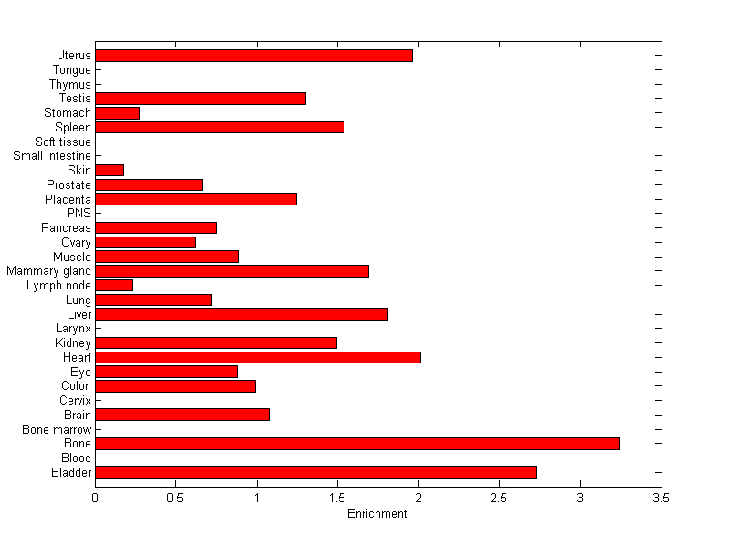 The expression level is normalized with tissue-library size. Each value for a gene in a tissue is a ratio of observed ESTs to the expected one in this tissue. The expected number of ESTs is the product of total ESTs of the gene and the fraction of total ESTs in the tissue among all ESTs in 30 tissues.