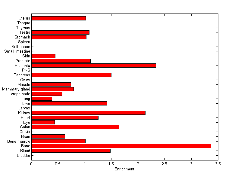 The expression level is normalized with tissue-library size. Each value for a gene in a tissue is a ratio of observed ESTs to the expected one in this tissue. The expected number of ESTs is the product of total ESTs of the gene and the fraction of total ESTs in the tissue among all ESTs in 30 tissues.