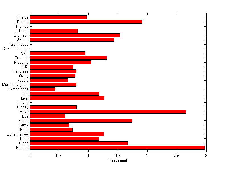 The expression level is normalized with tissue-library size. Each value for a gene in a tissue is a ratio of observed ESTs to the expected one in this tissue. The expected number of ESTs is the product of total ESTs of the gene and the fraction of total ESTs in the tissue among all ESTs in 30 tissues.