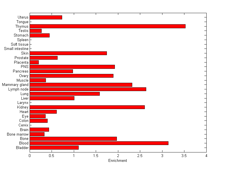 The expression level is normalized with tissue-library size. Each value for a gene in a tissue is a ratio of observed ESTs to the expected one in this tissue. The expected number of ESTs is the product of total ESTs of the gene and the fraction of total ESTs in the tissue among all ESTs in 30 tissues.