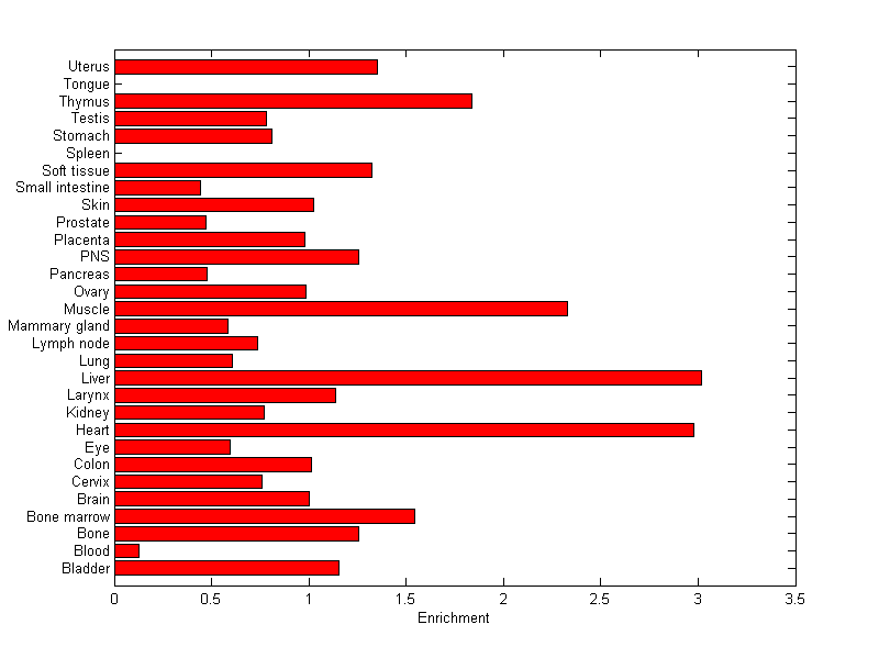 The expression level is normalized with tissue-library size. Each value for a gene in a tissue is a ratio of observed ESTs to the expected one in this tissue. The expected number of ESTs is the product of total ESTs of the gene and the fraction of total ESTs in the tissue among all ESTs in 30 tissues.