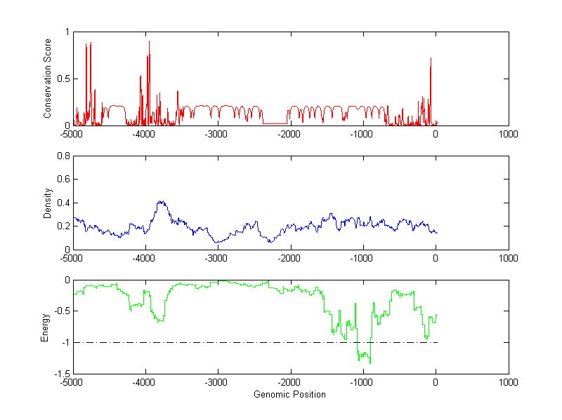 The energy profile (green curve) is about energy for module detection based on TF interaction. The positions with energy less than -1 indicate the existence of CRMs.