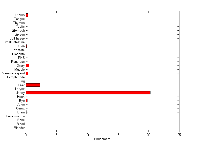 The expression level is normalized with tissue-library size. Each value for a gene in a tissue is a ratio of observed ESTs to the expected one in this tissue. The expected number of ESTs is the product of total ESTs of the gene and the fraction of total ESTs in the tissue among all ESTs in 30 tissues.