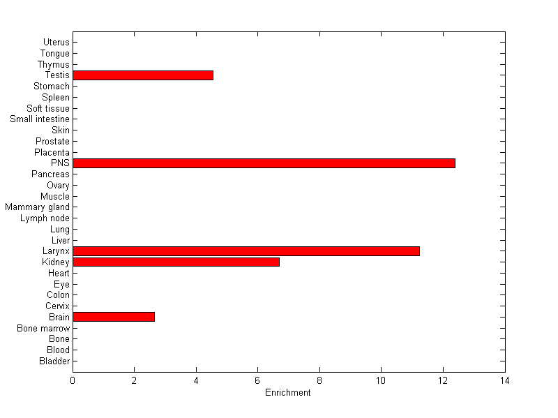 The expression level is normalized with tissue-library size. Each value for a gene in a tissue is a ratio of observed ESTs to the expected one in this tissue. The expected number of ESTs is the product of total ESTs of the gene and the fraction of total ESTs in the tissue among all ESTs in 30 tissues.