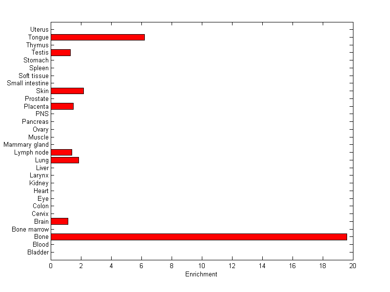 The expression level is normalized with tissue-library size. Each value for a gene in a tissue is a ratio of observed ESTs to the expected one in this tissue. The expected number of ESTs is the product of total ESTs of the gene and the fraction of total ESTs in the tissue among all ESTs in 30 tissues.