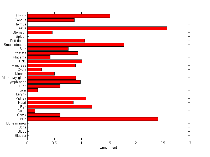 The expression level is normalized with tissue-library size. Each value for a gene in a tissue is a ratio of observed ESTs to the expected one in this tissue. The expected number of ESTs is the product of total ESTs of the gene and the fraction of total ESTs in the tissue among all ESTs in 30 tissues.