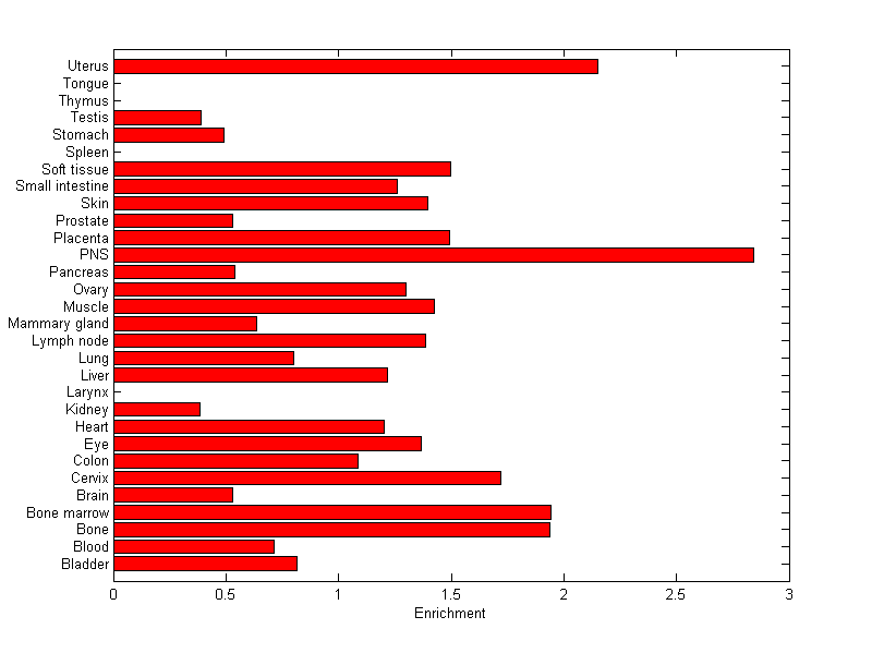 The expression level is normalized with tissue-library size. Each value for a gene in a tissue is a ratio of observed ESTs to the expected one in this tissue. The expected number of ESTs is the product of total ESTs of the gene and the fraction of total ESTs in the tissue among all ESTs in 30 tissues.