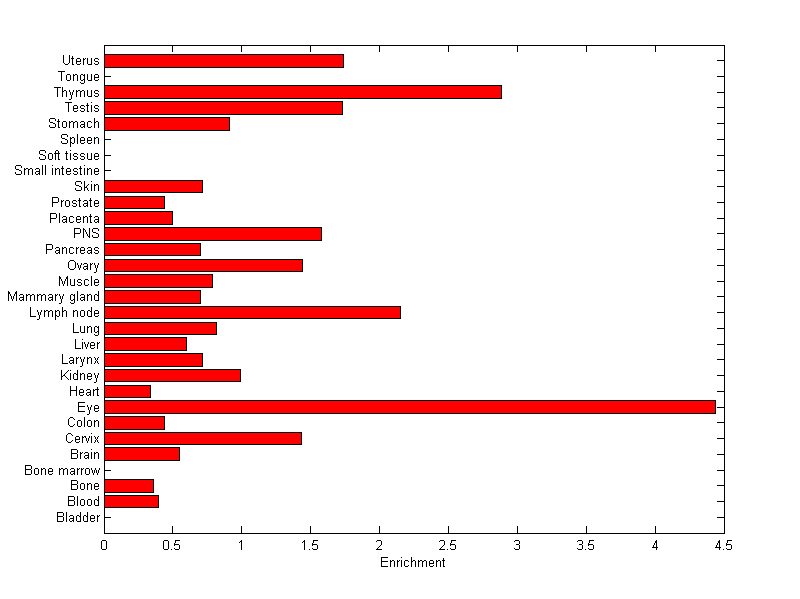 The expression level is normalized with tissue-library size. Each value for a gene in a tissue is a ratio of observed ESTs to the expected one in this tissue. The expected number of ESTs is the product of total ESTs of the gene and the fraction of total ESTs in the tissue among all ESTs in 30 tissues.