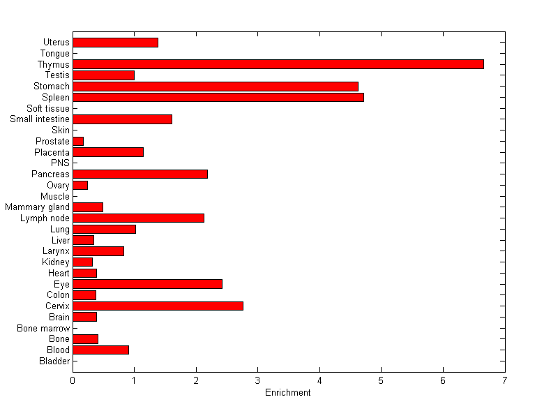 The expression level is normalized with tissue-library size. Each value for a gene in a tissue is a ratio of observed ESTs to the expected one in this tissue. The expected number of ESTs is the product of total ESTs of the gene and the fraction of total ESTs in the tissue among all ESTs in 30 tissues.