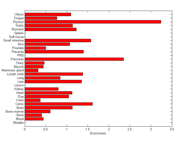The expression level is normalized with tissue-library size. Each value for a gene in a tissue is a ratio of observed ESTs to the expected one in this tissue. The expected number of ESTs is the product of total ESTs of the gene and the fraction of total ESTs in the tissue among all ESTs in 30 tissues.