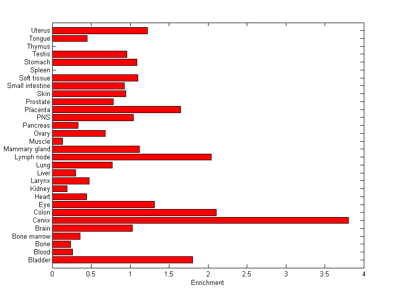 The expression level is normalized with tissue-library size. Each value for a gene in a tissue is a ratio of observed ESTs to the expected one in this tissue. The expected number of ESTs is the product of total ESTs of the gene and the fraction of total ESTs in the tissue among all ESTs in 30 tissues.