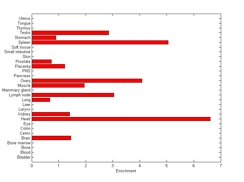 The expression level is normalized with tissue-library size. Each value for a gene in a tissue is a ratio of observed ESTs to the expected one in this tissue. The expected number of ESTs is the product of total ESTs of the gene and the fraction of total ESTs in the tissue among all ESTs in 30 tissues.