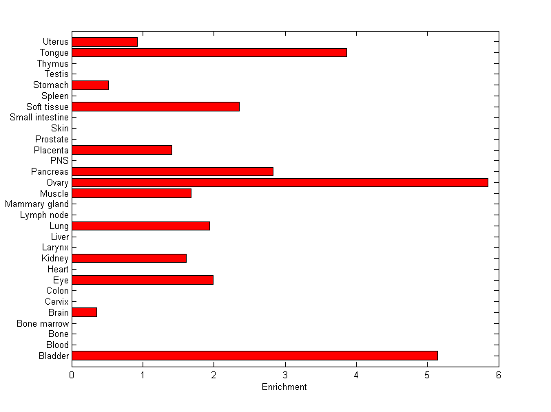 The expression level is normalized with tissue-library size. Each value for a gene in a tissue is a ratio of observed ESTs to the expected one in this tissue. The expected number of ESTs is the product of total ESTs of the gene and the fraction of total ESTs in the tissue among all ESTs in 30 tissues.