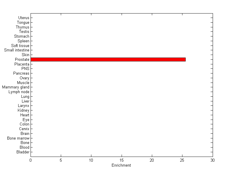 The expression level is normalized with tissue-library size. Each value for a gene in a tissue is a ratio of observed ESTs to the expected one in this tissue. The expected number of ESTs is the product of total ESTs of the gene and the fraction of total ESTs in the tissue among all ESTs in 30 tissues.