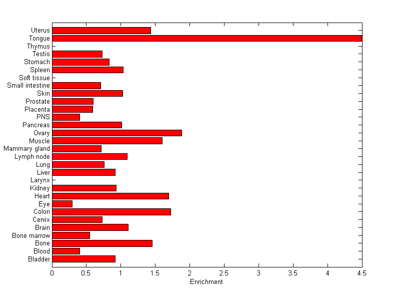 The expression level is normalized with tissue-library size. Each value for a gene in a tissue is a ratio of observed ESTs to the expected one in this tissue. The expected number of ESTs is the product of total ESTs of the gene and the fraction of total ESTs in the tissue among all ESTs in 30 tissues.