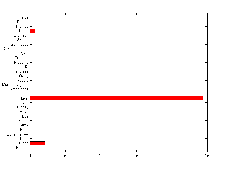 The expression level is normalized with tissue-library size. Each value for a gene in a tissue is a ratio of observed ESTs to the expected one in this tissue. The expected number of ESTs is the product of total ESTs of the gene and the fraction of total ESTs in the tissue among all ESTs in 30 tissues.