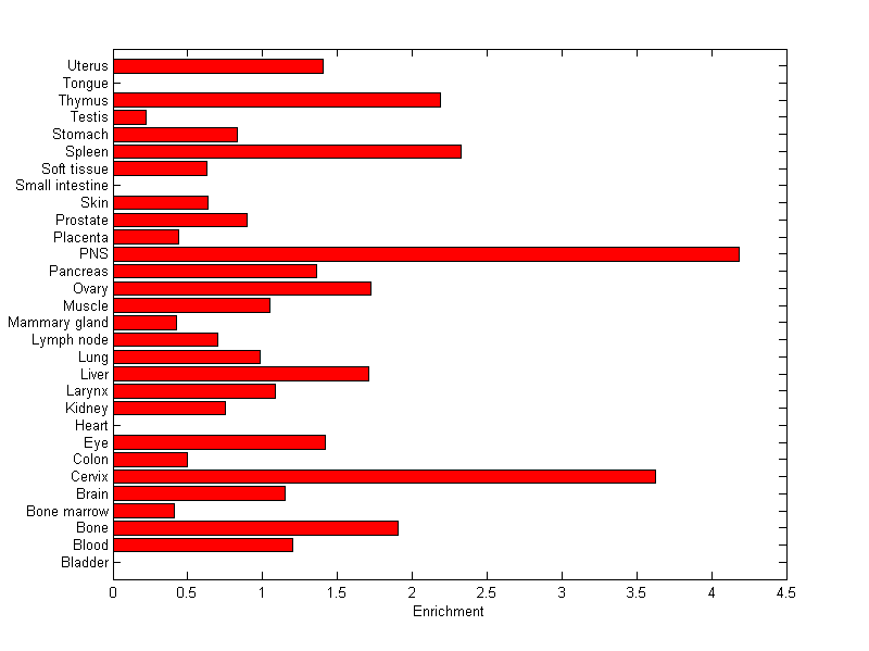 The expression level is normalized with tissue-library size. Each value for a gene in a tissue is a ratio of observed ESTs to the expected one in this tissue. The expected number of ESTs is the product of total ESTs of the gene and the fraction of total ESTs in the tissue among all ESTs in 30 tissues.
