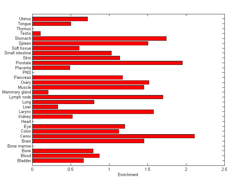 The expression level is normalized with tissue-library size. Each value for a gene in a tissue is a ratio of observed ESTs to the expected one in this tissue. The expected number of ESTs is the product of total ESTs of the gene and the fraction of total ESTs in the tissue among all ESTs in 30 tissues.