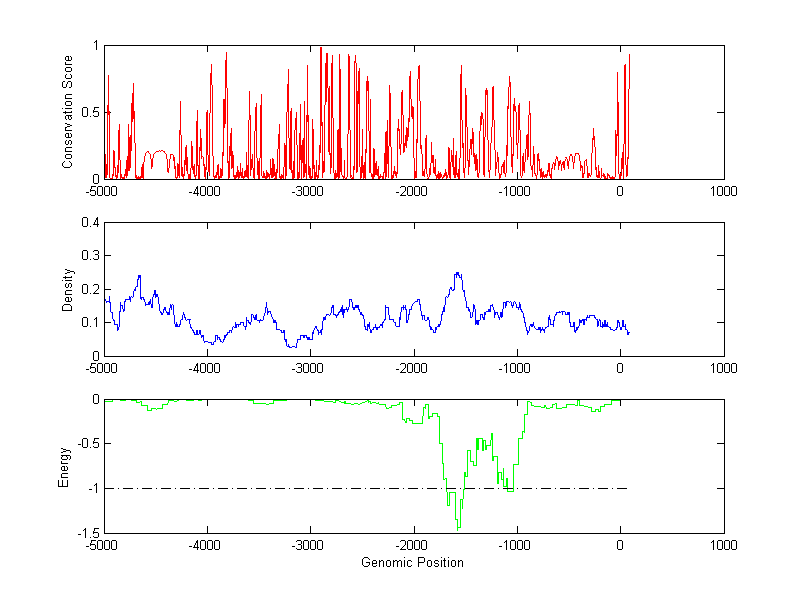 About the profiles: The conservation profile (red curve) is about conservation scores of the promoter sequences. Conservation was determined from an eight-way alignment of human, chimpanzee, dog, mouse, rat, chicken, zebrafish and fugu sequences. The conservation was quantified by a conservation score between 0 and 1, with 1 as highest conservation. The conservation score was obtained from UCSC genome databases. The density profile (blue curve) is about density of all TF binding sites. The energy profile (green curve) is about energy for module detection based on TF interaction. The positions with energy less than -1 indicate the existence of CRMs. Download: Conservation profileDensity profile Energy profile CRM summary |