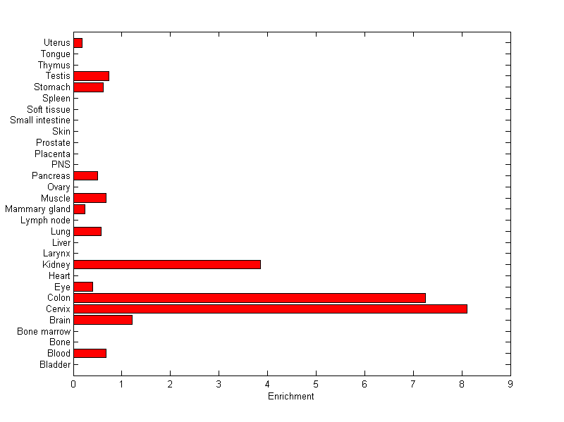 About the profile: The expression level is normalized with tissue-library size. Each value for a gene in a tissue is a ratio of observed ESTs to the expected one in this tissue. The expected number of ESTs is the product of total ESTs of the gene and the fraction of total ESTs in the tissue among all ESTs in 30 tissues. Summary: This gene is preferentially expressed in [cervix, colon] Download: |