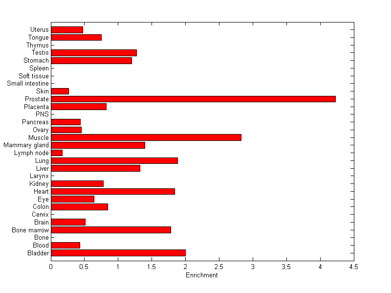 The expression level is normalized with tissue-library size. Each value for a gene in a tissue is a ratio of observed ESTs to the expected one in this tissue. The expected number of ESTs is the product of total ESTs of the gene and the fraction of total ESTs in the tissue among all ESTs in 30 tissues.