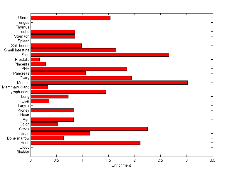 The expression level is normalized with tissue-library size. Each value for a gene in a tissue is a ratio of observed ESTs to the expected one in this tissue. The expected number of ESTs is the product of total ESTs of the gene and the fraction of total ESTs in the tissue among all ESTs in 30 tissues.