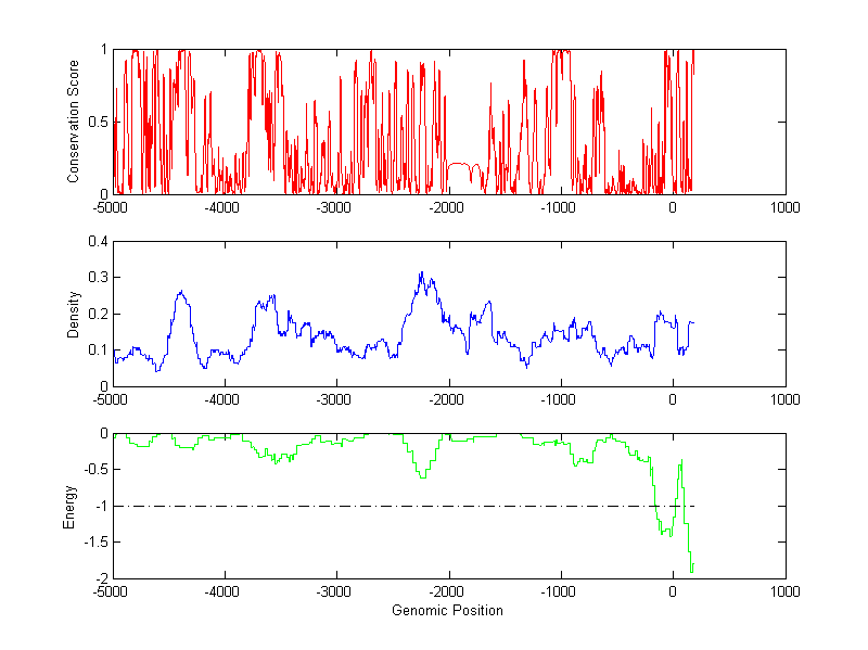 The energy profile (green curve) is about energy for module detection based on TF interaction. The positions with energy less than -1 indicate the existence of CRMs.