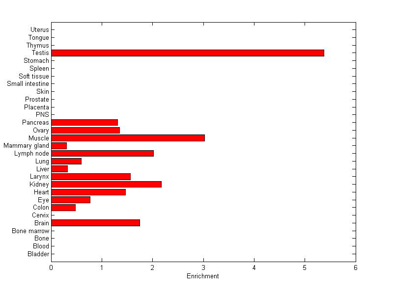 The expression level is normalized with tissue-library size. Each value for a gene in a tissue is a ratio of observed ESTs to the expected one in this tissue. The expected number of ESTs is the product of total ESTs of the gene and the fraction of total ESTs in the tissue among all ESTs in 30 tissues.