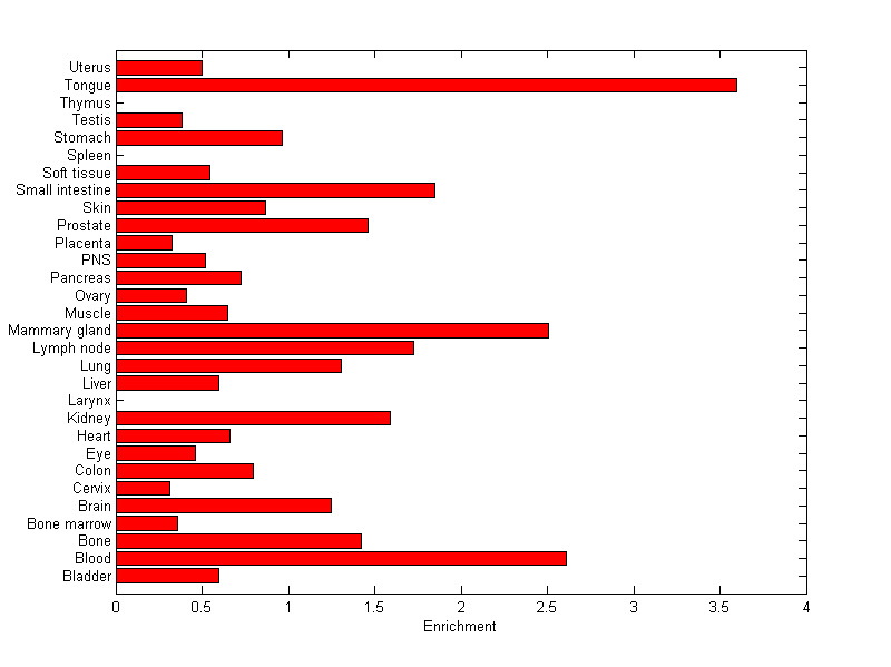 The expression level is normalized with tissue-library size. Each value for a gene in a tissue is a ratio of observed ESTs to the expected one in this tissue. The expected number of ESTs is the product of total ESTs of the gene and the fraction of total ESTs in the tissue among all ESTs in 30 tissues.
