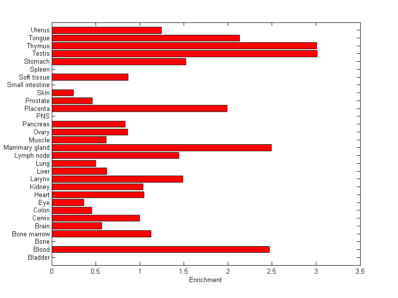 The expression level is normalized with tissue-library size. Each value for a gene in a tissue is a ratio of observed ESTs to the expected one in this tissue. The expected number of ESTs is the product of total ESTs of the gene and the fraction of total ESTs in the tissue among all ESTs in 30 tissues.