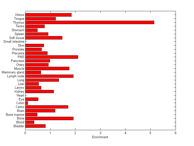 The expression level is normalized with tissue-library size. Each value for a gene in a tissue is a ratio of observed ESTs to the expected one in this tissue. The expected number of ESTs is the product of total ESTs of the gene and the fraction of total ESTs in the tissue among all ESTs in 30 tissues.