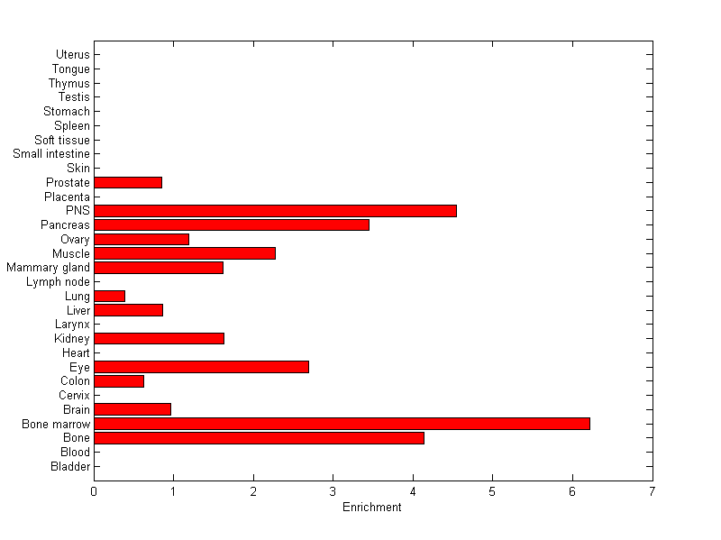 The expression level is normalized with tissue-library size. Each value for a gene in a tissue is a ratio of observed ESTs to the expected one in this tissue. The expected number of ESTs is the product of total ESTs of the gene and the fraction of total ESTs in the tissue among all ESTs in 30 tissues.