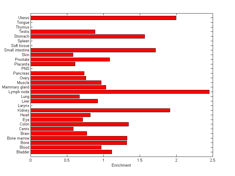 The expression level is normalized with tissue-library size. Each value for a gene in a tissue is a ratio of observed ESTs to the expected one in this tissue. The expected number of ESTs is the product of total ESTs of the gene and the fraction of total ESTs in the tissue among all ESTs in 30 tissues.