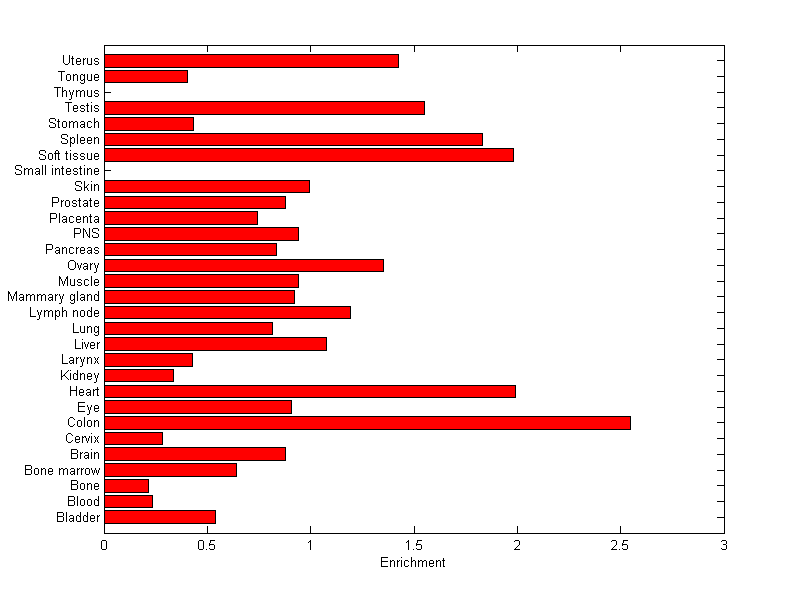 The expression level is normalized with tissue-library size. Each value for a gene in a tissue is a ratio of observed ESTs to the expected one in this tissue. The expected number of ESTs is the product of total ESTs of the gene and the fraction of total ESTs in the tissue among all ESTs in 30 tissues.