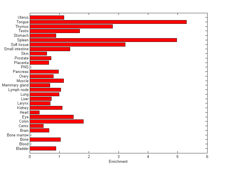 The expression level is normalized with tissue-library size. Each value for a gene in a tissue is a ratio of observed ESTs to the expected one in this tissue. The expected number of ESTs is the product of total ESTs of the gene and the fraction of total ESTs in the tissue among all ESTs in 30 tissues.