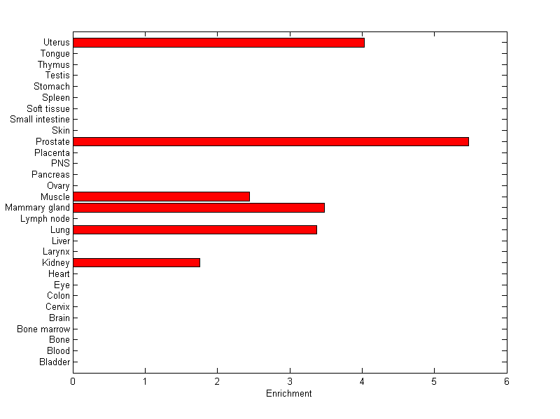 The expression level is normalized with tissue-library size. Each value for a gene in a tissue is a ratio of observed ESTs to the expected one in this tissue. The expected number of ESTs is the product of total ESTs of the gene and the fraction of total ESTs in the tissue among all ESTs in 30 tissues.