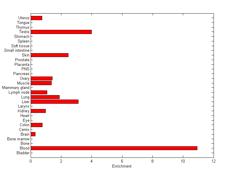 The expression level is normalized with tissue-library size. Each value for a gene in a tissue is a ratio of observed ESTs to the expected one in this tissue. The expected number of ESTs is the product of total ESTs of the gene and the fraction of total ESTs in the tissue among all ESTs in 30 tissues.