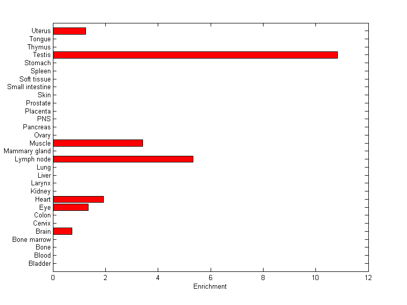 The expression level is normalized with tissue-library size. Each value for a gene in a tissue is a ratio of observed ESTs to the expected one in this tissue. The expected number of ESTs is the product of total ESTs of the gene and the fraction of total ESTs in the tissue among all ESTs in 30 tissues.