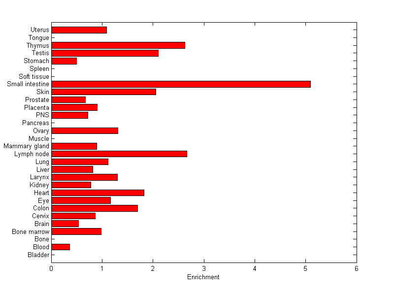 The expression level is normalized with tissue-library size. Each value for a gene in a tissue is a ratio of observed ESTs to the expected one in this tissue. The expected number of ESTs is the product of total ESTs of the gene and the fraction of total ESTs in the tissue among all ESTs in 30 tissues.