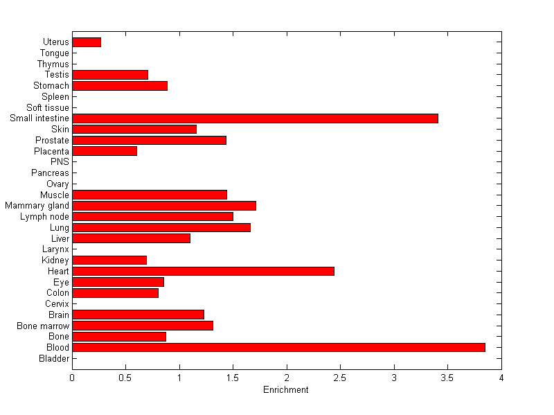 The expression level is normalized with tissue-library size. Each value for a gene in a tissue is a ratio of observed ESTs to the expected one in this tissue. The expected number of ESTs is the product of total ESTs of the gene and the fraction of total ESTs in the tissue among all ESTs in 30 tissues.