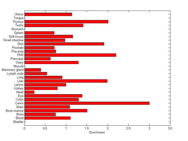 The expression level is normalized with tissue-library size. Each value for a gene in a tissue is a ratio of observed ESTs to the expected one in this tissue. The expected number of ESTs is the product of total ESTs of the gene and the fraction of total ESTs in the tissue among all ESTs in 30 tissues.